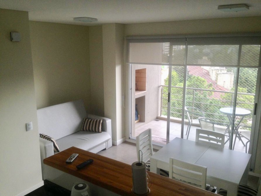 Depto 2 amb 7º Piso c/1 dormitorio c/ventanal vista al parque, pisos porcelanato y placard, living - comedor c/cocina integrada c/barra, baño completo c/bañera, balcon c/parrilla. Sperficie cubierta 50 m2 + 10 m2 de balcon, cochera cubierta.